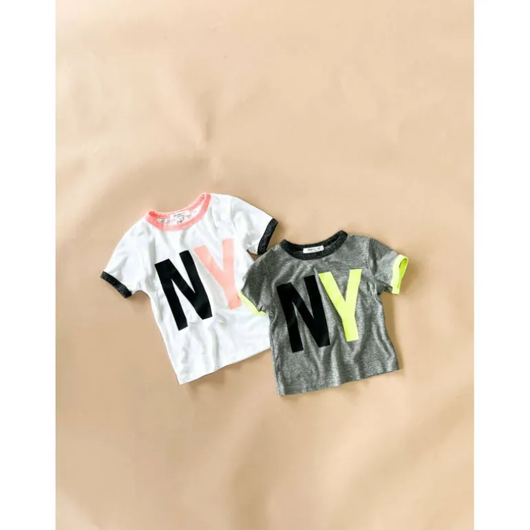 NY print tee with neon contrast.